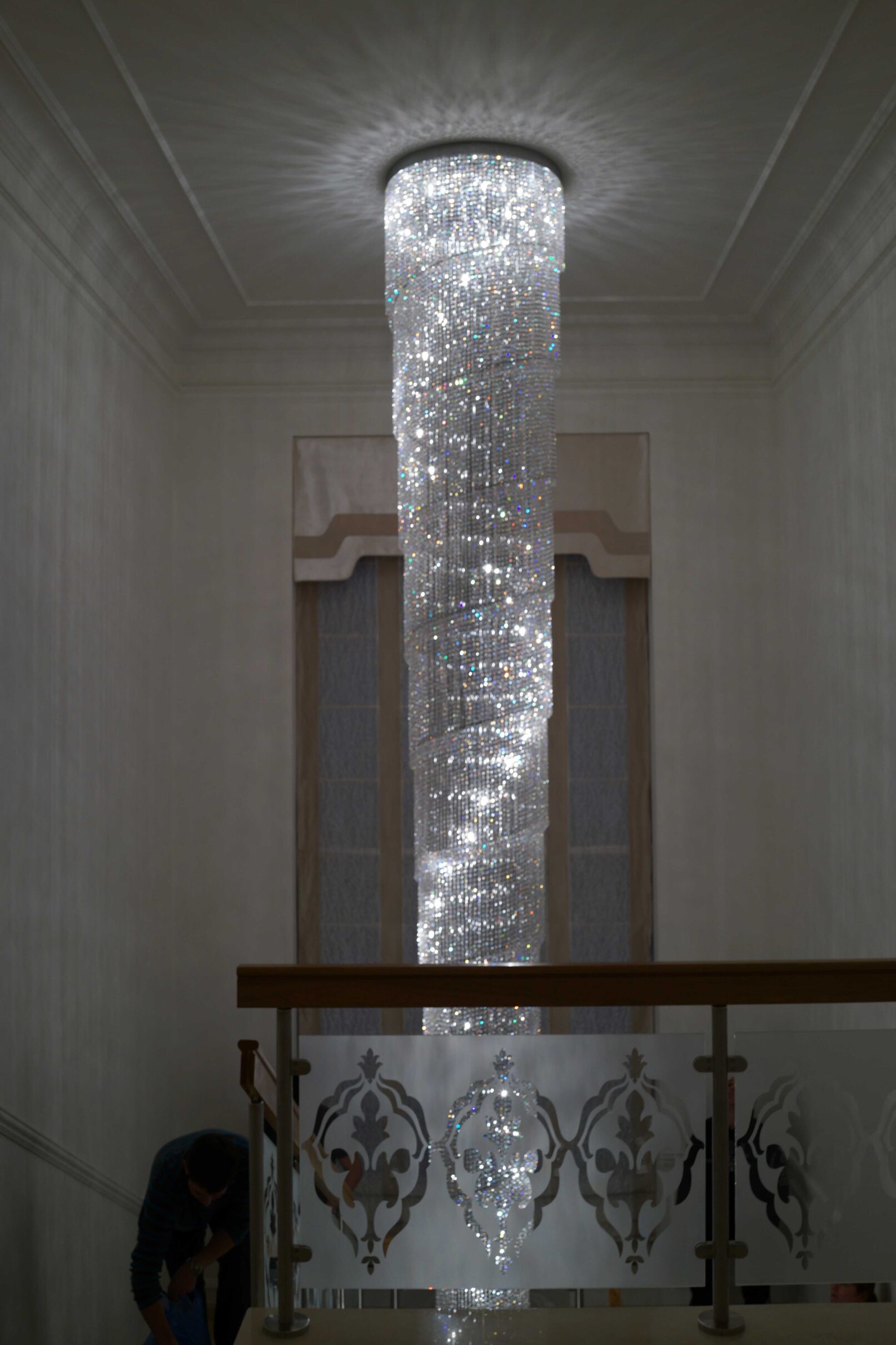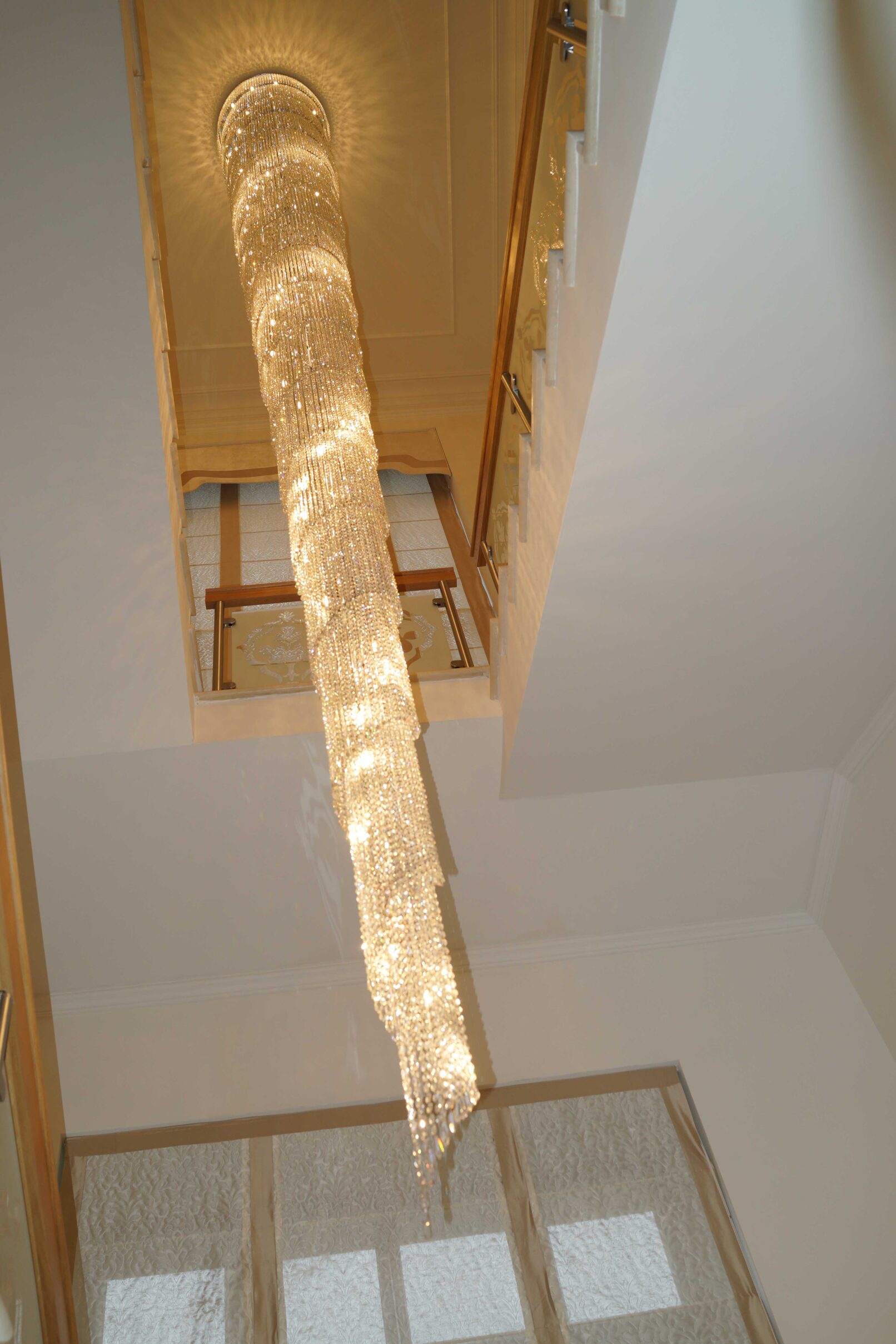 Project in Private Residence with large spiral-shaped lamp made of brass structure and decorated in glass.